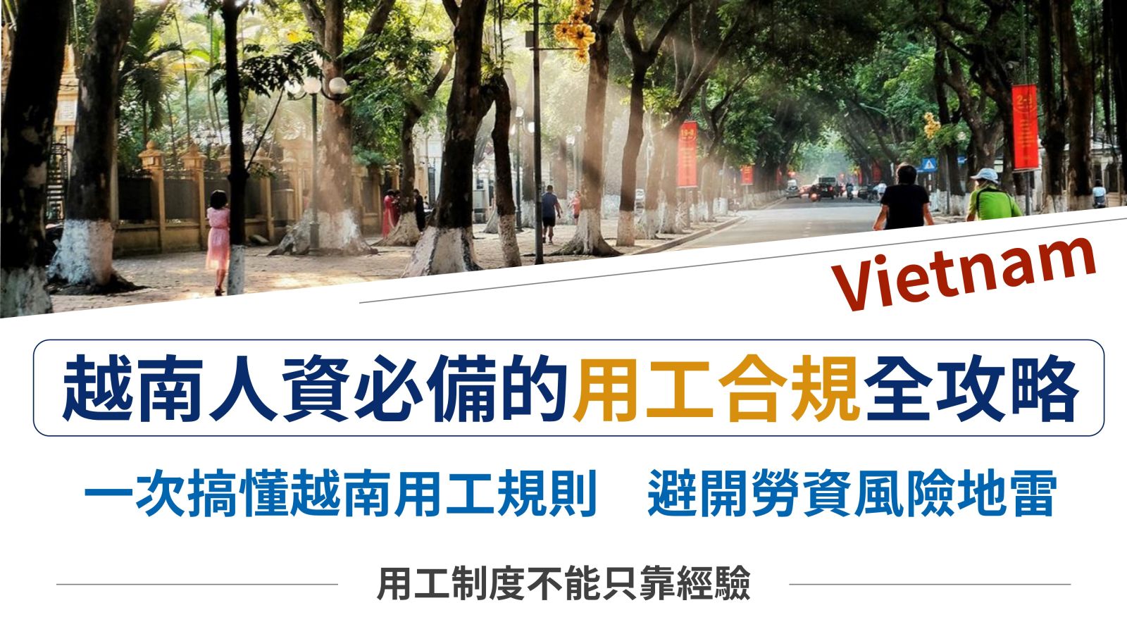 本課程深入解析越南勞動法規25大核心規範,勞動法規、工時假期、社會保險、個人所得稅、外籍就業規定與離職資遣等,全面拆解越南勞動相關法規實務。搭配台灣相同法規作為參照,讓您快速理解越南勞動相關法規,協助企業人資與經營者快速理解異地法規差異,避開法律風險,讓跨境經營更穩健。