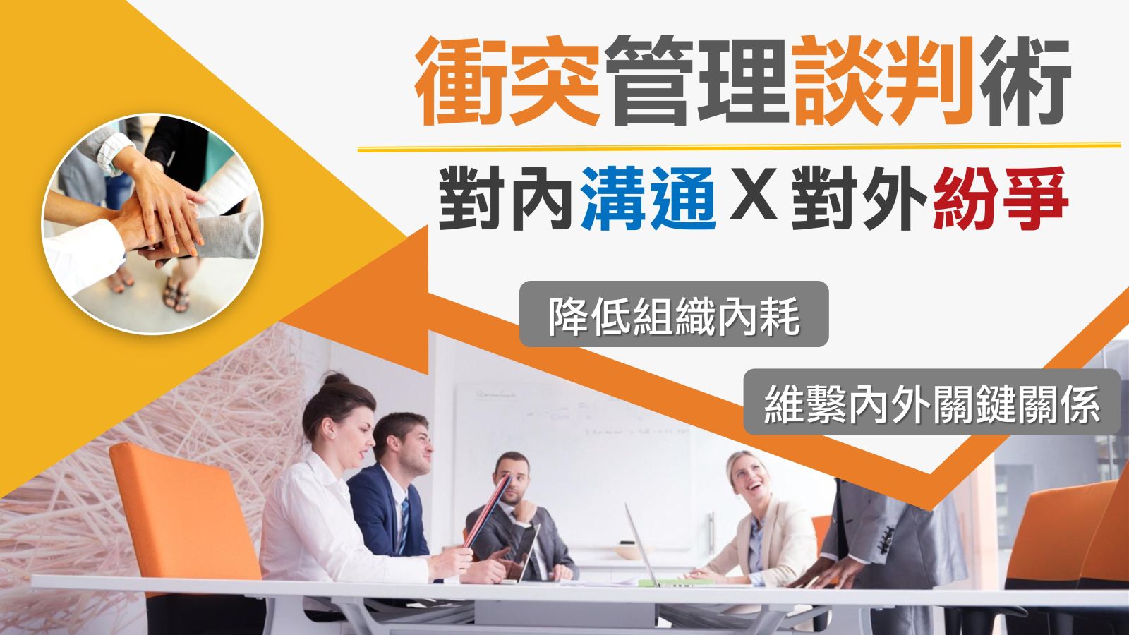本課程幫助您建立一套清晰可用的衝突應對框架,精準處理對上、對平級、對外的業務衝突,將人際耗損轉化為問題解決,降低組織內耗、維繫內外關鍵關係。