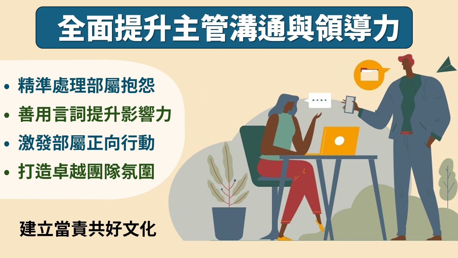 本課程協助主管,面對部屬的負面抱怨時先認知彼此情緒。透過合宜的言詞訓練,辨識抱怨徵兆,避免成員陷入”受害者循環”的心態。其次透過績效面談:傾聽、發問、回應技巧,解決部屬抱怨的事項,導正行為。讓彼此勇於當責,培養高 EQ情緒管理,建立當責與共好的文化。