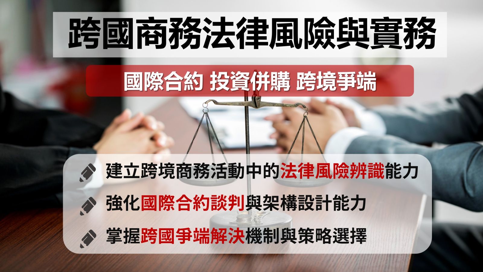 隨著企業國際化、供應鏈全球布局及對外投資頻率日增,企業面臨的商務法律問題已不再侷限於本國制度,從合約簽署、國際運輸、智慧財產,到境外投資、稅務規避、法律適用與爭端解決,跨國法律風險管理成為企業法務與管理層無法忽視的核心課題。本課程由具備美國與台灣律師資格之實務律師授課,透過實際案件、契約樣本與判決解析,帶領學員深入掌握跨國交易常見風險、合約設計要點、法律適用與國際爭端處理策略,並建構企業內部因應架構,強化法遵與治理能力。