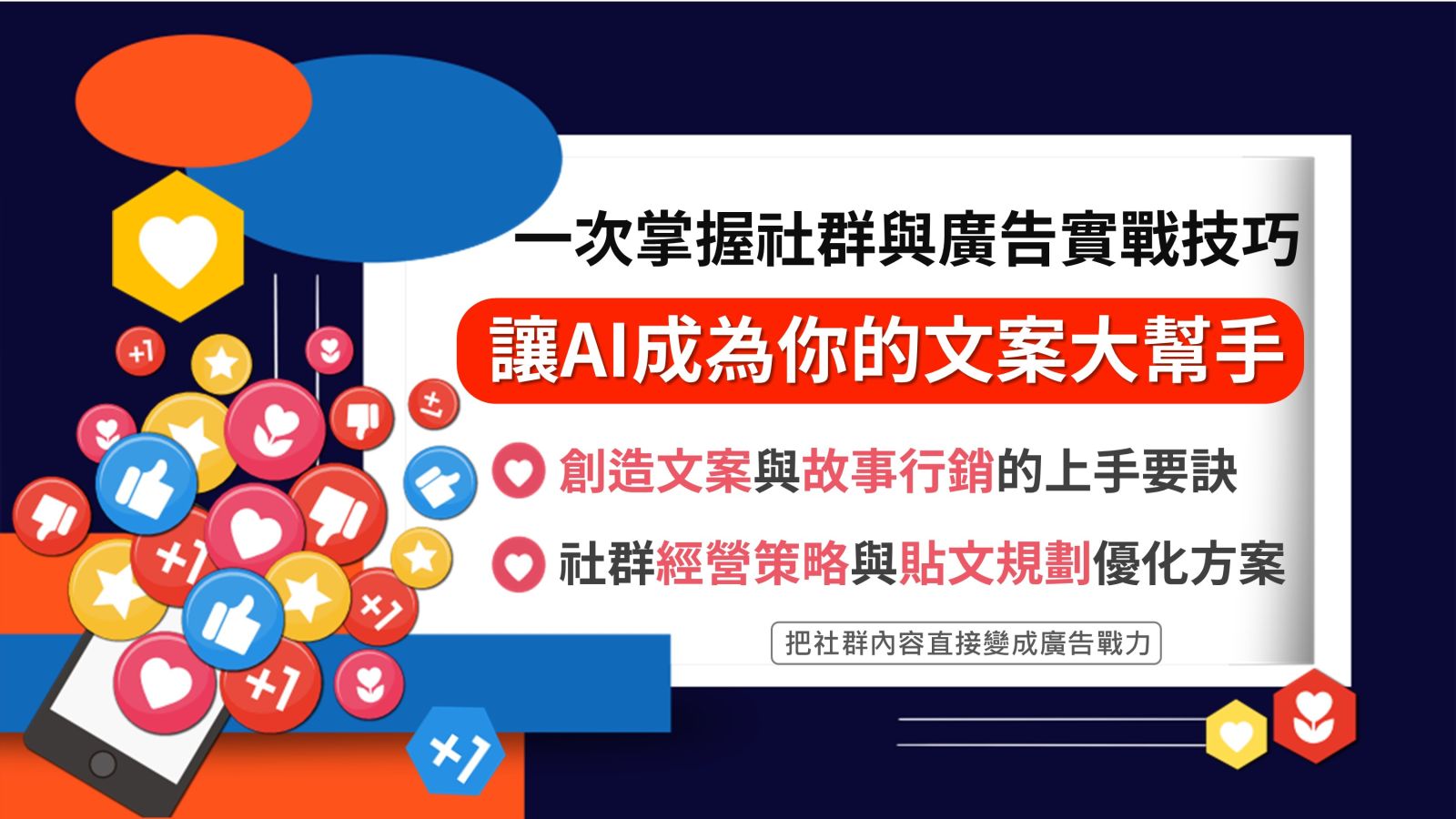 課程同時著重於廣告文案實戰,從標題、內容、CTA、活動口號到故事行銷,示範如何透過 AI 產出多版本文案、快速測試與調整,讓社群內容不只被看見,更能支援行銷與轉換目標。