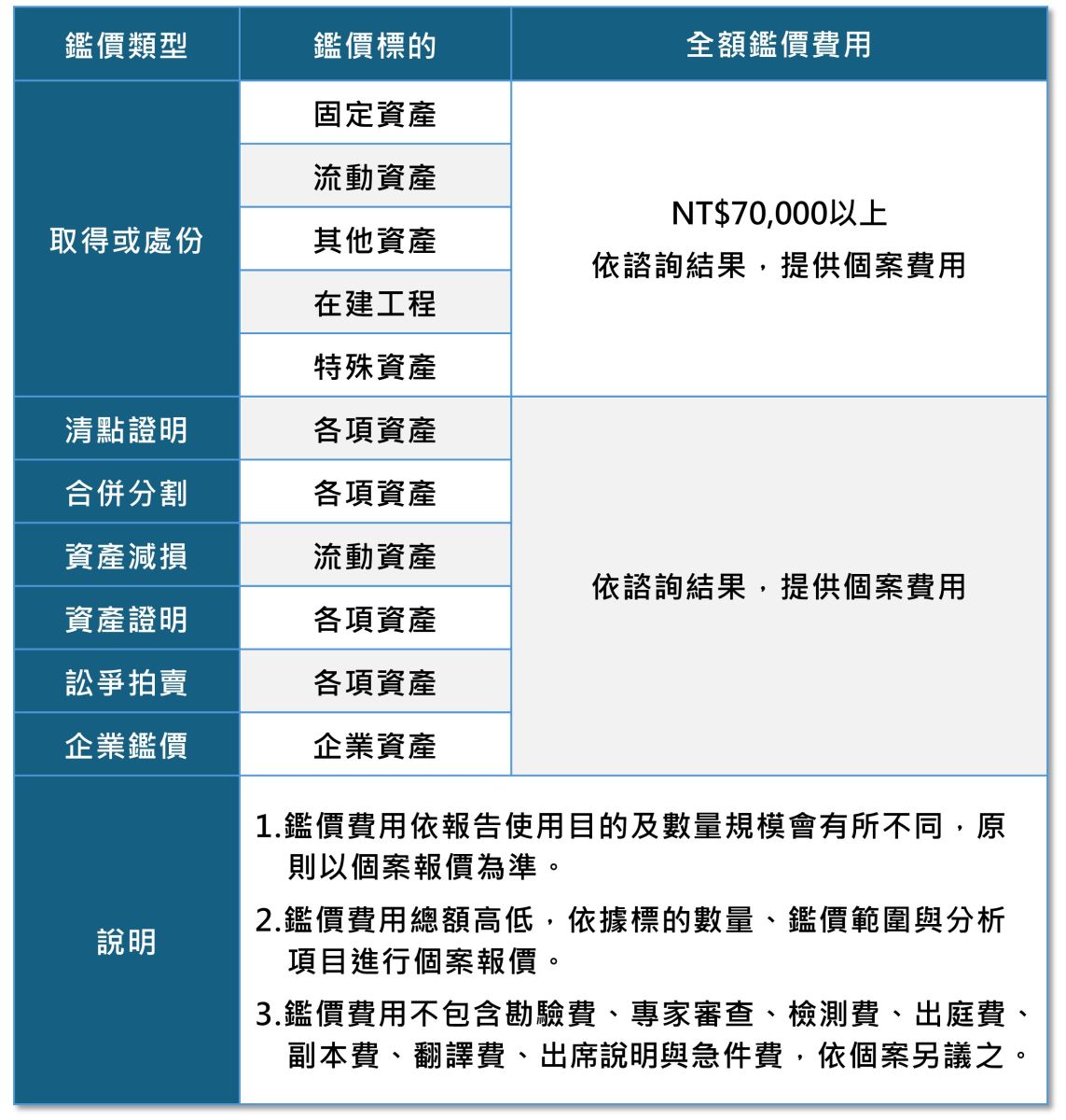 為國內重要之資產鑑價培訓機構,賦予鑑價專業資格與認證制度,提供各大企業資產鑑價與技術審核服務,累積眾多類案件與實績,更深受律師、會計師等專業人士及政府、司法、金融等機構之倚信。